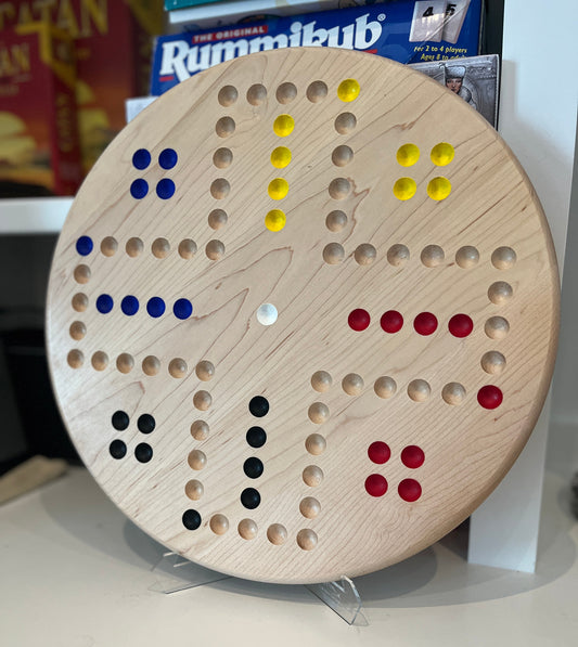 Handmade 6-Player Wahoo / Aggravation Game Board – Natural Hardwood Circle Board with Marbles & Dice