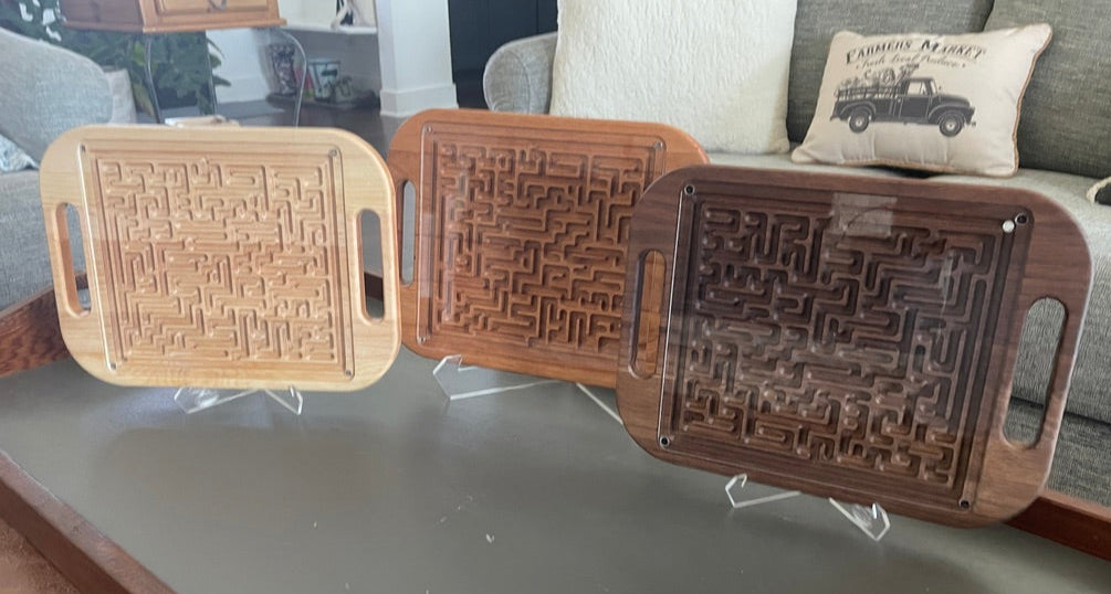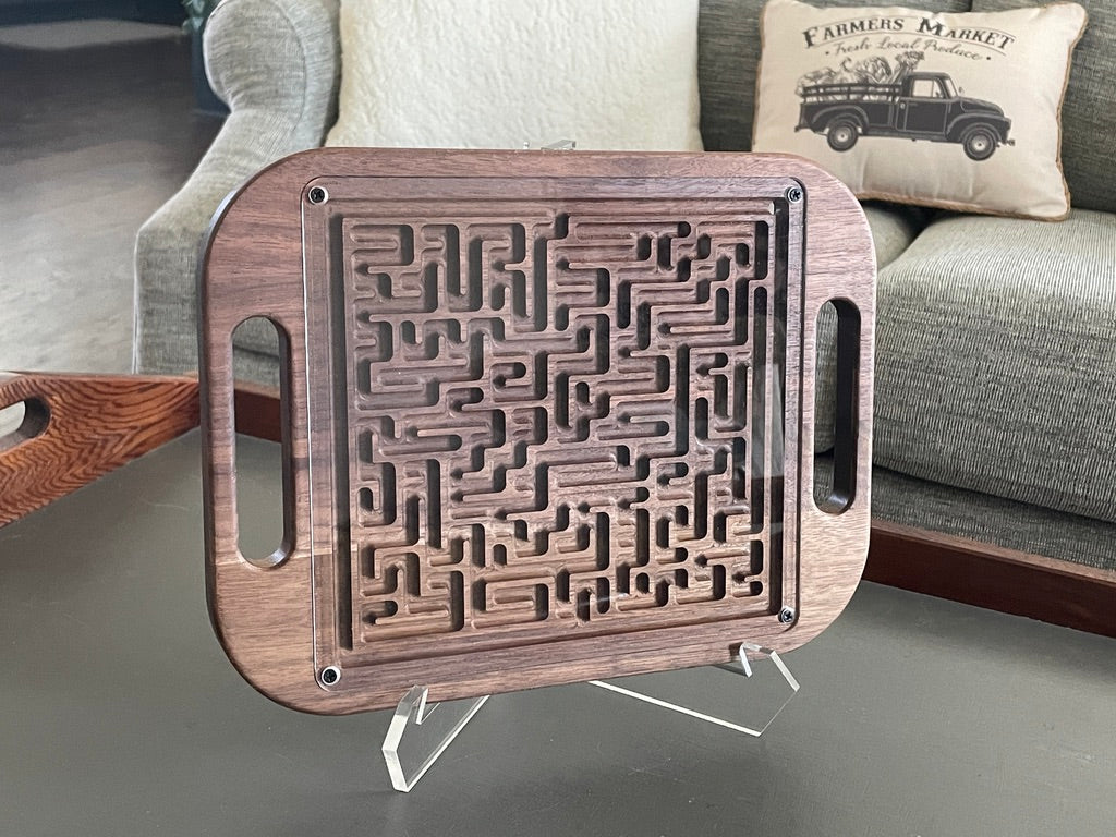 🪵 Made from your choice of Maple, Cherry, or Walnut hardwood, this elegant puzzle features smooth chamfered edges, side handles for easy play, and a protective clear finish that enhances the natural wood grain. Each side of the maze offers a different path, keeping the experience fresh, challenging, and interactive.
